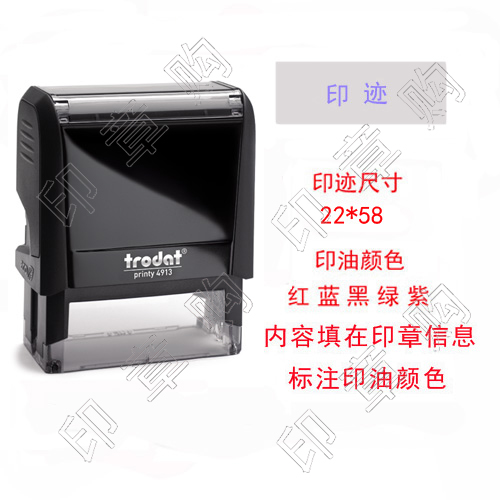 品牌:卓达规格:58 x 22mm优势:轻松盖印,印迹清晰,干净整洁,100,000次以上盖印寿命1. 使用方便——连续盖印,1次完成2. 印迹清晰——高精度,15年不退色3. 内置印台——方便注油;可更换印台4. 全景视窗——提高效率5. 精确盖印定位对准设计,防滑设计